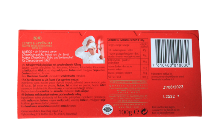 Ingredients: sugar, vegetable fat (copra, palm kernel), cocoa butter, cocoa mass, whole milk powder, lactose, skimmed milk powder, concentrated milk butter, emulsifier (soya lecithin), barley malt extract, flavours.