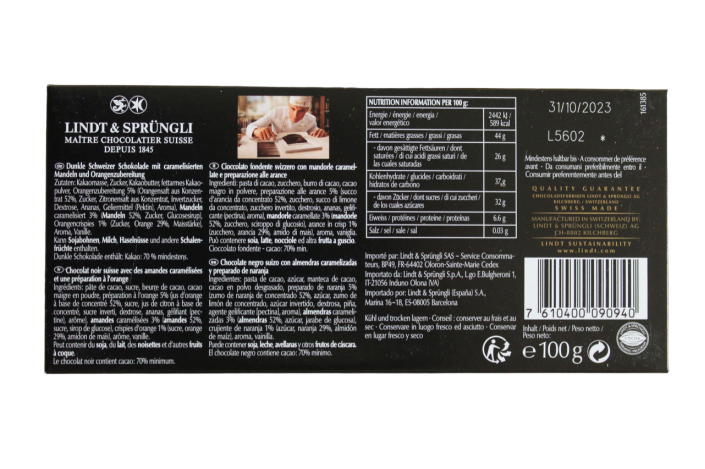 Description: Swiss dark chocolate with caramelized almonds and orange preparation