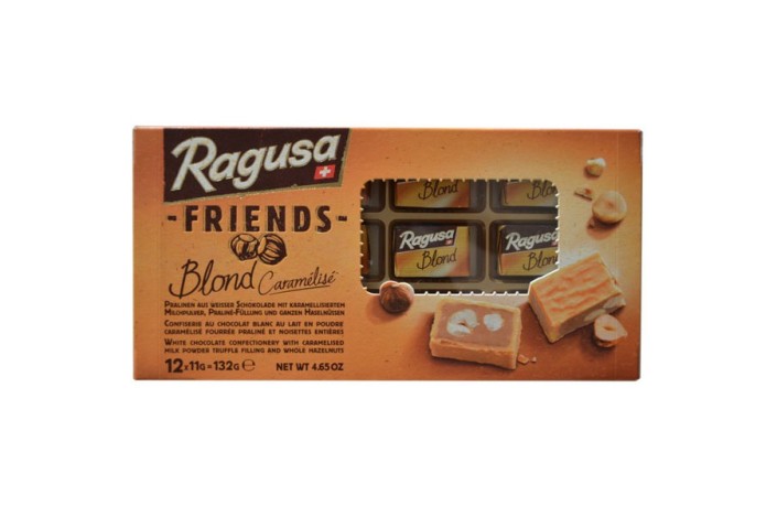 White chocolate confectionnery with caremelized milk powder, truffle filling (72%) and whole hazelnuts