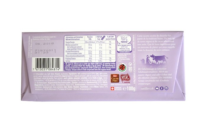 Ingredients: Sweetened condensed milk 51%, sugar, cocoa butter, cocoa, butterfat, emulsifier (soya lecithin), vanilla extract. May contain traces of hazelnuts, almonds, wheat and egg. Cocoa solids : 28% minimum. Milk solids : 20% minimum.