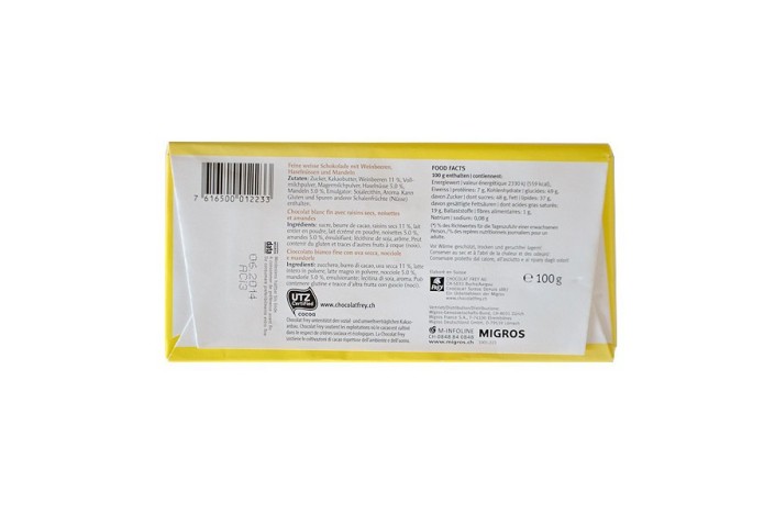 Description: Perfectly unctuous, this fabulous white chocolate, stuffed with raisins and almonds, is irresistible. Crunch as much as you want.