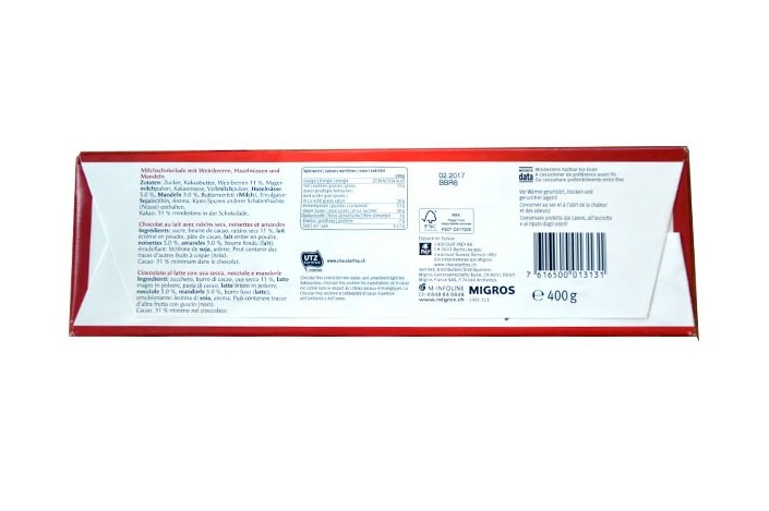 Ingredients: sugar, cocoa butter, raisins 11%, skimmed milk powder, cocoa mass, almonds 5.0%, 5.0% hazelnuts, whole milk powder, butterfat (milk), emulsifier: soya lecithin, flavoring. May contain gluten and traces of other nuts (walnuts). Cocoa: 31% minimum in chocolate.