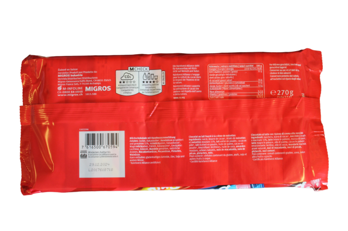 Ingredients: sugar, cocoa butter, ground hazelnuts and hazelnuts 10%, whole milk powder, cocoa mass, skimmed milk powder, palm oil, cocoa powder, coconut oil, emulsifier: soy lecithin, almonds ground, natural flavors, macadamia nuts, pecans, pistachios, walnuts. Cocoa: 33% minimum in chocolate Milk: 14% minimum in chocolate.