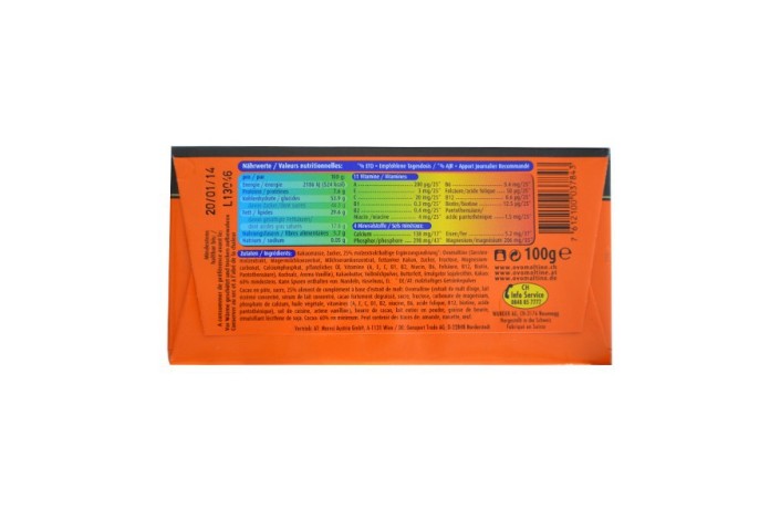 Ingredients : cocoa mass, sugar, 25% food supplement containing malt extract: ovomaltine (exrait barley malt, concentrated skim milk, whey concentrate, reduced cocoa, sugar, fructose, magnesium carbonate, phosphate calcium, vegetable oil, vitamins (A, E, C, B1, B2, niacin, B6, folic acid, B12, biotin, pantothenic acid), salt, flavoring vanillin), cocoa butter, whole milk powder, whole milk powder, butterfat, emulsifier soya lecithin. Cocoa: 60% minimum. May contain traces of almonds, hazelnuts and egg.