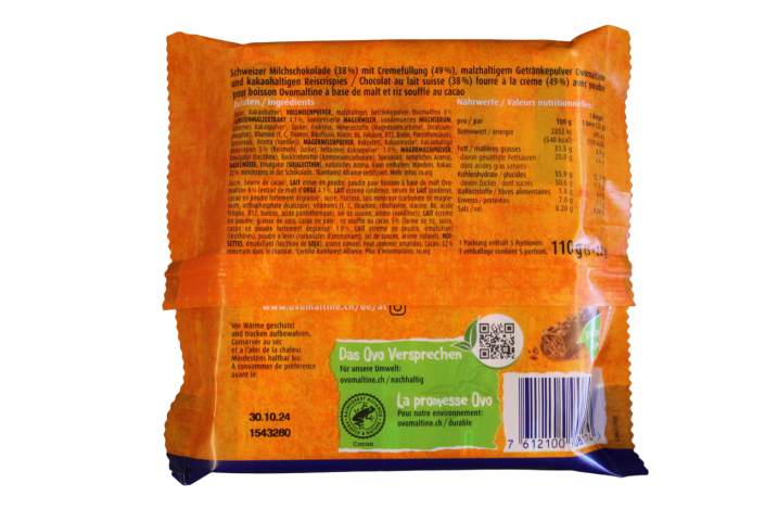 Ingredientes: azúcar, manteca de cacao, leche entera en polvo, bebida de malta en polvo Ovaltine 8% (extracto de malta de cebada 4. 1%, leche condensada desnatada, suero de leche condensada, cacao alto en grasa en polvo, azúcar, fructosa, sales minerales (carbonato de magnesio, ortofosfato, dicálcico), vitaminas (E, C, tiamina, riboflavina, niacina, B6, ácido fólico, B12, biotina, ácido pantoténico), sal gorda, aroma (vainillina)), leche desnatada en polvo, grasa de coco, pasta de cacao, arroz inflado con cacao 5% (harina de arroz, azúcar, cacao desgrasado en polvo 1%, leche desnatada en polvo, emulgente (lecitinas), gasificante (carbonatos de amonio), sal gorda, aroma natural), avellanas, emulgente (lecitina de soja), aroma natural.