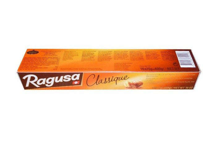 Ingredientes : azúcar, avellanas, masa de cacao, manteca de cacao, manteca vegetal (coco, de almendra de palma), leche entera en polvo, harina de soja, mantequilla derretida, leche desnatada en polvo, emulsionante (lecitina de soja), vainillina. Puede contener trazas de almendras.