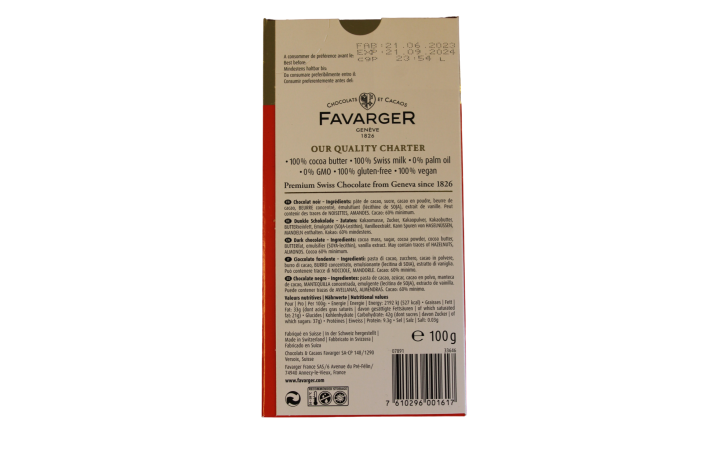 Ingredientes: pasta de cacao, azúcar, cacao en polvo, manteca de cacao, mantequilla concentrada, emulgente (lecitina de soja), extracto de vainilla.