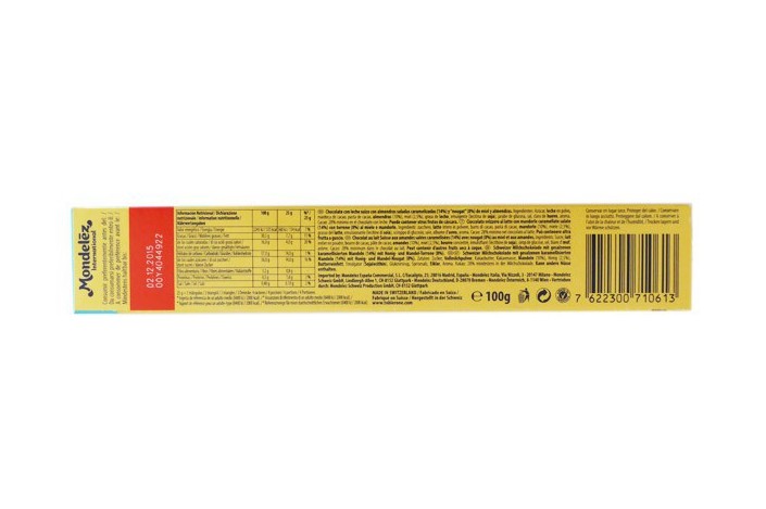 Ingredientes : azúcar, alomds salados (almendras caramelizadas (67%), azúcar, jarabe de glucosa, sal, grasa de la leche), leche entera en polvo, manteca de cacao, pasta de cacao, miel (2,5%), grasa de leche, almendras (1%), emulsionante (lecitina de soja), polvo de clara de huevo, aroma (vainillina). El chocolate con leche contiene: cacao sólido mínimo del 28%. Sólidos lácteos: 14% mínimo. Contiene huevo, leche, almendras, soja. Puede contener trazas de otros frutos secos.