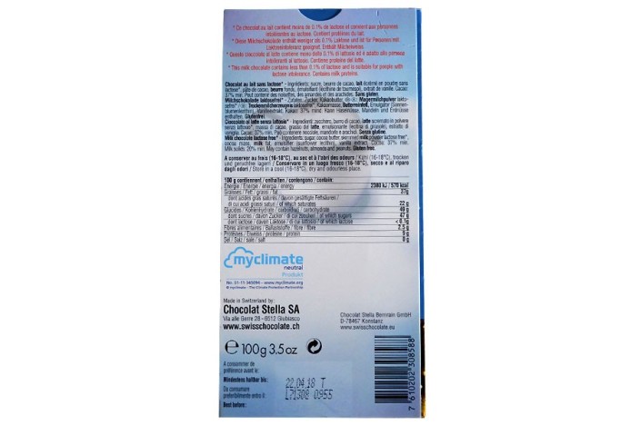 Description : Ce chocolat au lait contient moins de 0,1% de lactose et convient aux personnes souffrant d'intolérance au lactose.Il contient des protéines de lait.