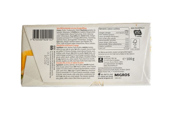 Ingrédients : sucre, dextrose, huile de palme, noisettes moulues, beurre de cacao, pâte de cacao, lait entier en poudre, écorces d'oranges confites 5 % (écorces d'oranges, sirop de glucose-fructose, sucre, acidifiant : acide citrique), lait écrémé en poudre, beurre fondu, concentré d'oranges aromatisé 0.3 % (jus d'oranges concentré, sirop de glucose, arôme naturel, acidifiant : acide citrique), émulsifiant : lécithine de soja, huile de coco, arômes naturels. Cacao : 34 % minimum dans le chocolat Lait : 18 % minimum dans le chocolat